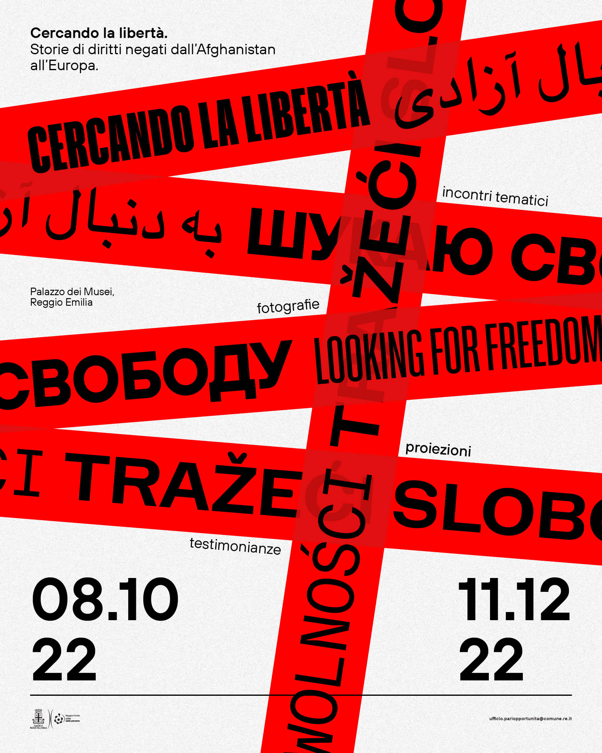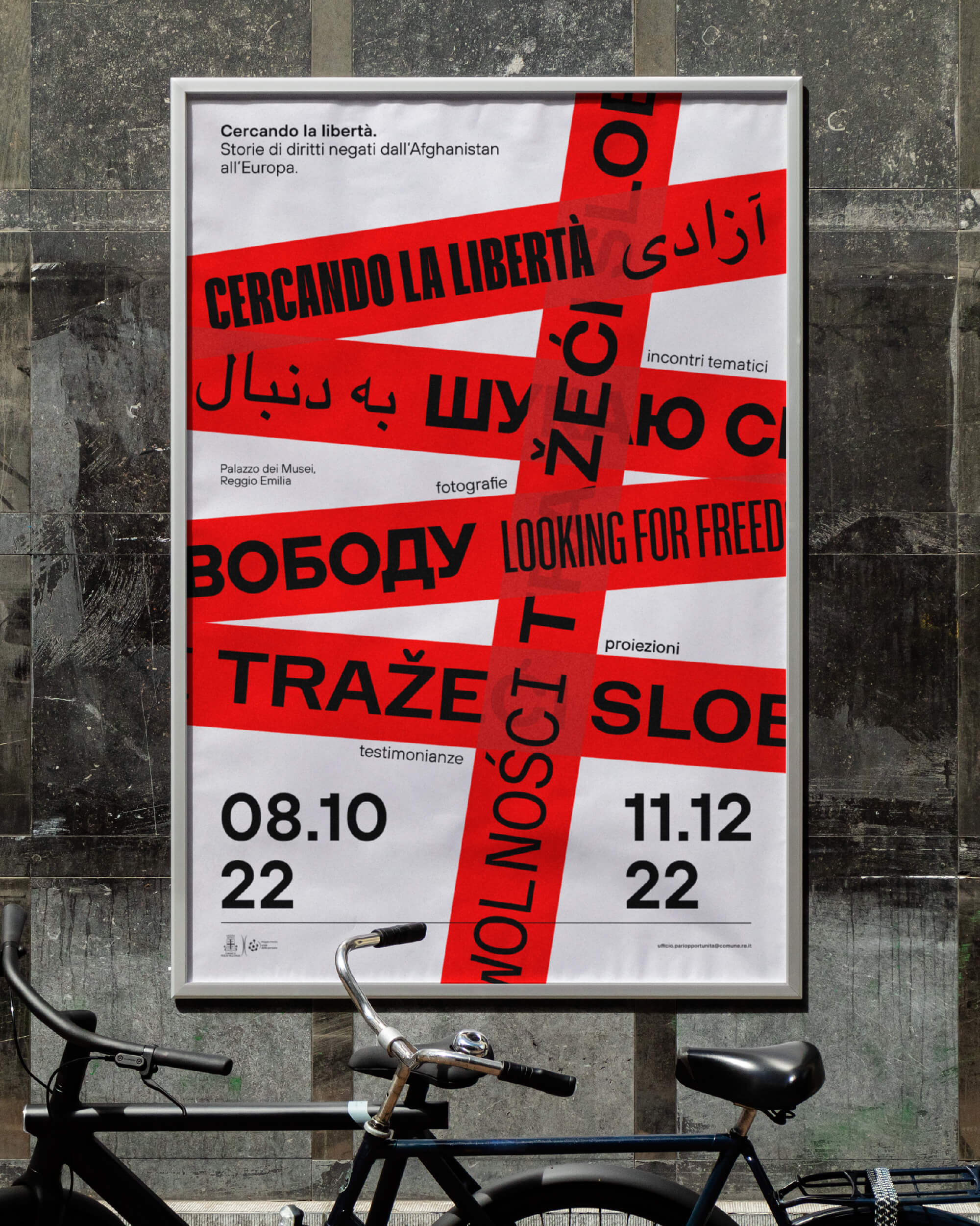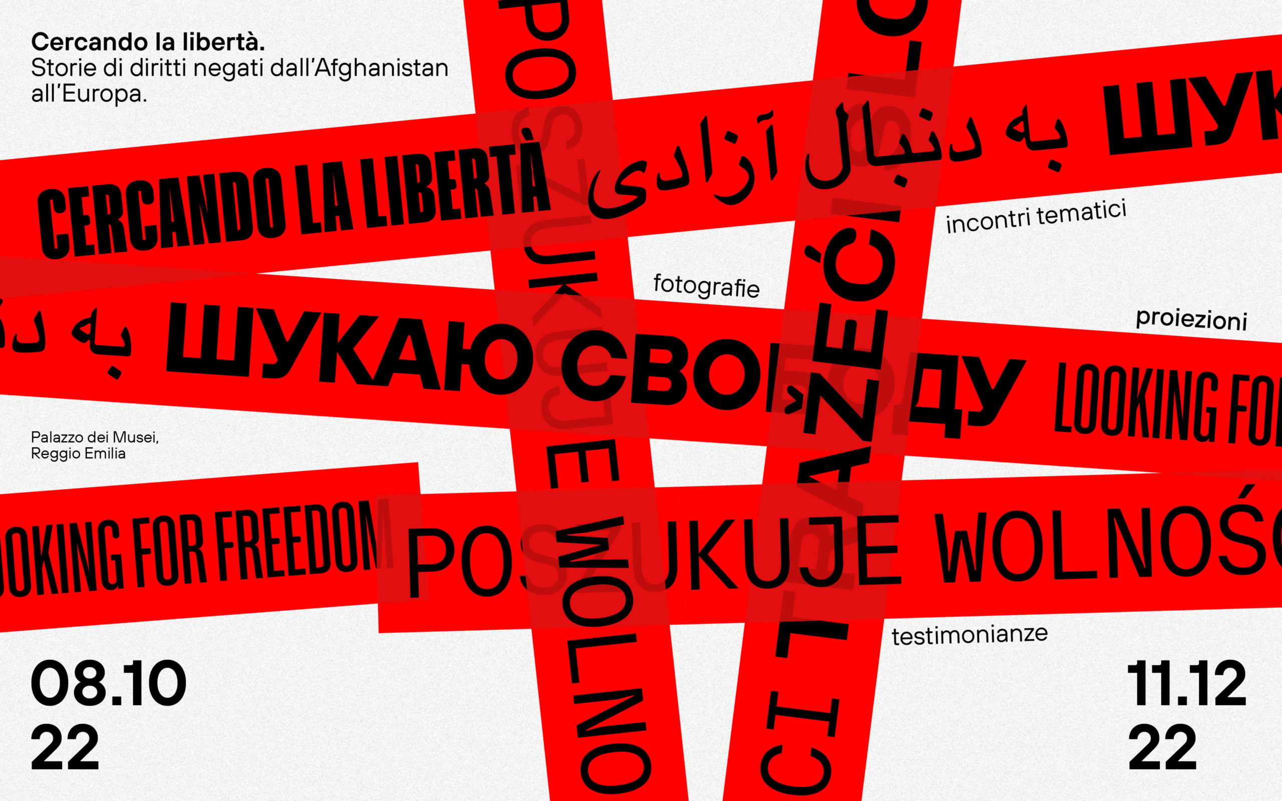 Cercando la libertà” è il nome di un percorso espositivo e un programma correlato di incontri, testimonianze e proiezioni creato e promosso dal Comune di Reggio Emilia. Questo progetto vuole riaccendere una luce sulle tante situazioni di crisi e di conflitto che mettono a repentaglio i diritti civili partendo dall’Afghanistan fino ai confini dell’Unione Europea, in particolare sulle difficilissime condizioni delle donne che vivono e hanno vissuto la guerra sul proprio corpo e sulle pratiche di resistenza messe in atto per lottare a favore dei propri diritti. Con l’intenzione di sintetizzare i valori di questa manifestazione, ho realizzato un manifesto e la sua identità.
